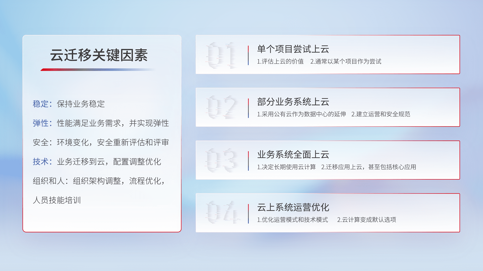 结合实际业务,,,,从规划设计、、云平台选型、、、云原生改造、、数据迁移、、集成交付,,,,迁移全过程为客户识别最佳上云路径,,,,做好风险识别管理,,,,设计网络架构、、身份权限、、、安全审计合规、、操作审计、、日志审计、、、、监控告警策略、、、、多站点容灾设计等,,对云上基础设施进行整体规划,,,提升IT治理水平,,以满足弹性、、、、高可用、、、高性能的需求。。。。