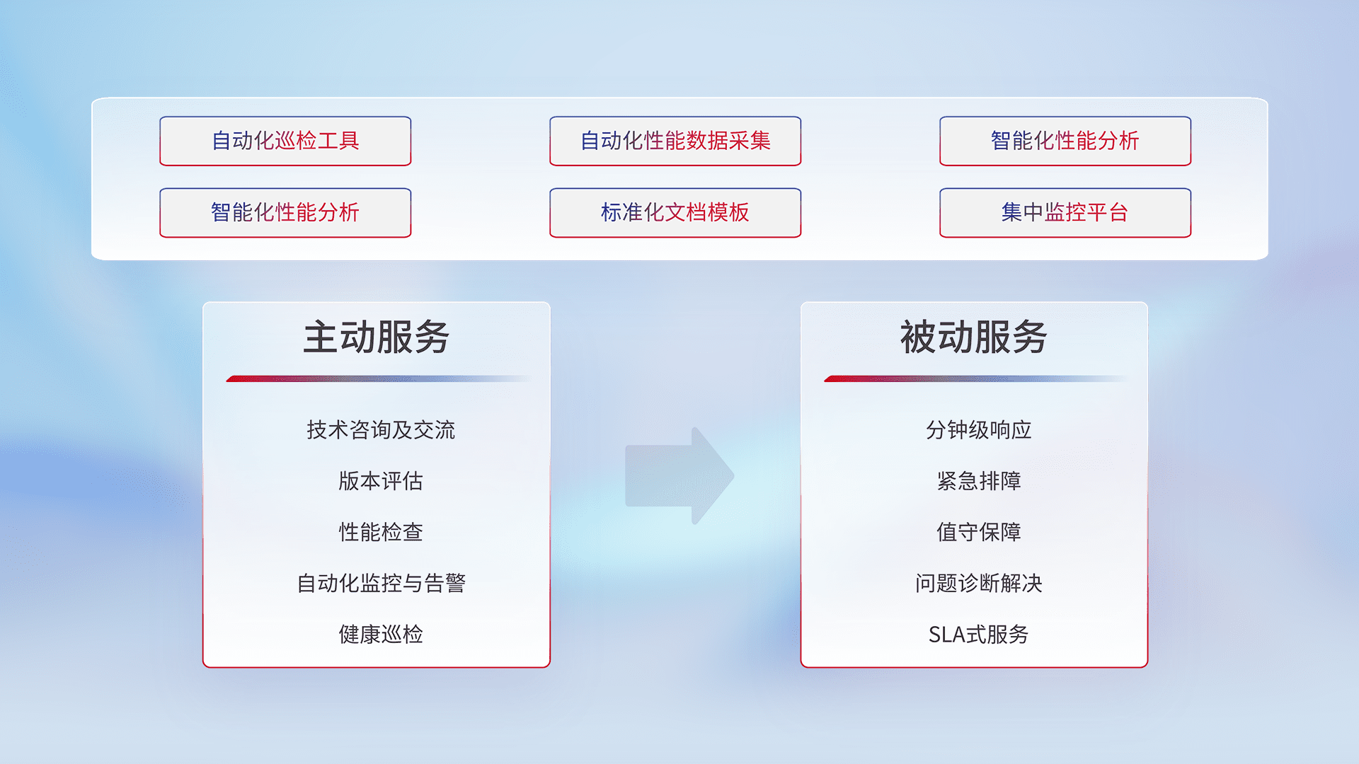 智能化工具和标准化文档,,,,保障服务质量,,提供主动服务(包含技术咨询、、、版本评估、、、、性能检查、、、、自动化监控与告警、、健康巡检)和被动服务包含(分钟级响应、、紧急排障、、、值守保障、、、、问题诊断解决、、、SLA服务)。。
